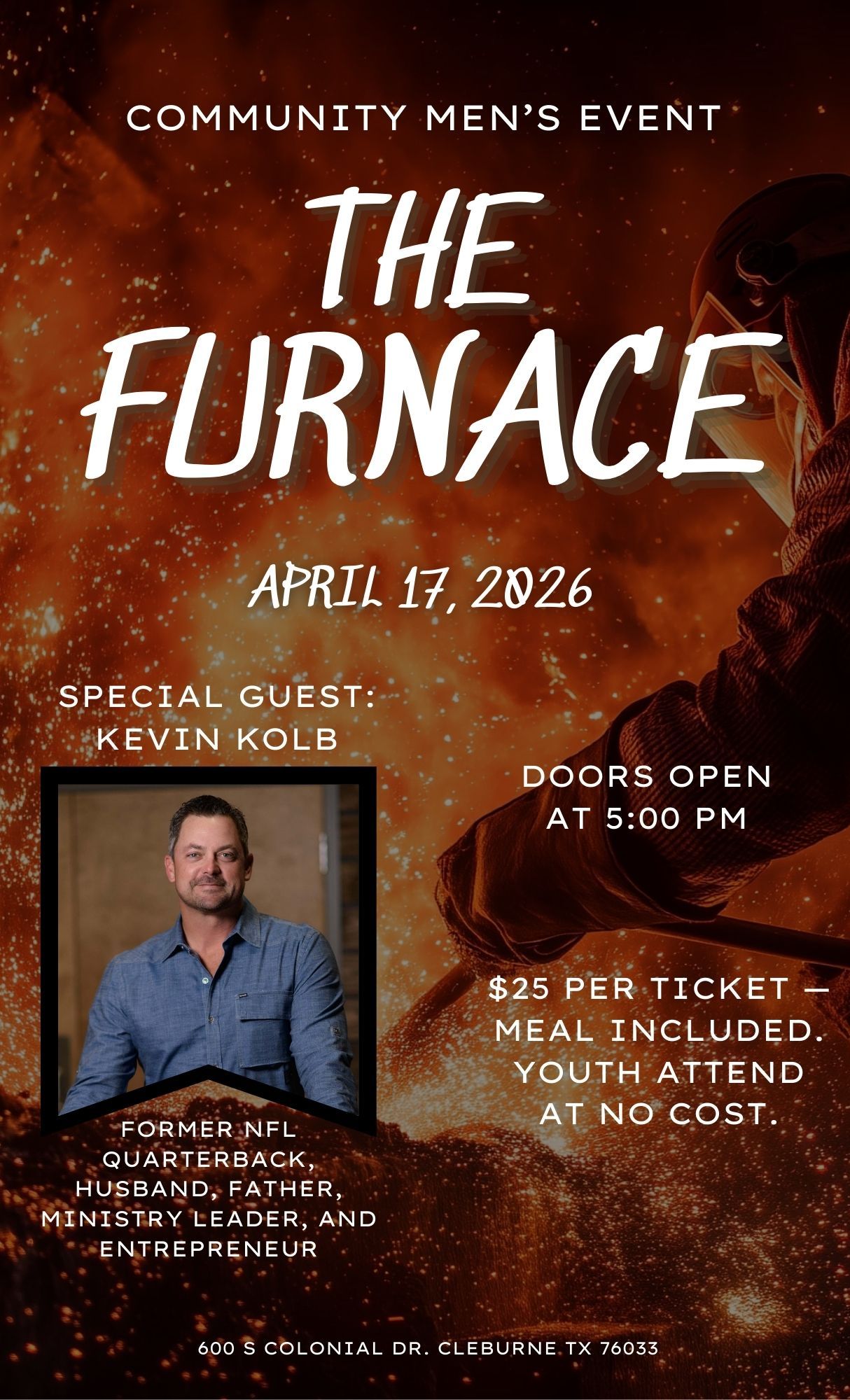 The Furnace is a Community Men’s Event in Cleburne, TX. The event was established to bring men and young men of Cleburne and Johnson County together for a night of fellowship, worship, and an encouraging and challenging message. This year’s speaker is former NFL quarterback and current ministry leader and business owner Kevin Kolb. Kevin is going to deliver a challenging message to men. The event will occur at Bethel Temple in Cleburne. Food will be provided by Roscoe’s Smokehouse in Burleson. The event has a ticket charge of $25 for men, but youth and kids are free. Look for tickets at your local church or call Bethel Temple 817-645-2781.