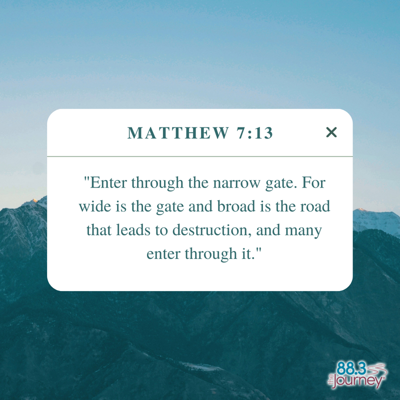 Matthew 7:13 Enter through the narrow gate. For wide is the gate and broad is the road that leads